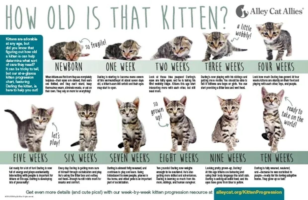 Kittens age quickly. Knowing their age is critical in determining the best course of action to help them.